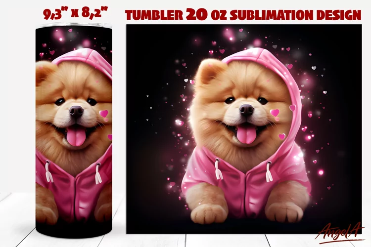 20 oz dog tumbler design is tumbler wrap sublimation design of Chow chow dog in pink hoodie with pink hearts.