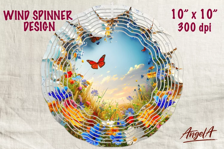 Flower wind spinner sublimation design will perfect as decor of your house and as outdoor decorations! This is a wind spinner sublimation design of field of wildflowers, nature scene with flying butterfly. You can add any text.