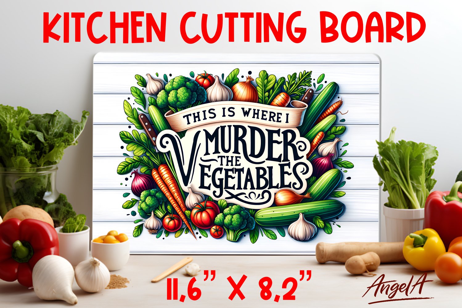 Kitchen cutting board is design for sublimation with funny kitchen quote This is where I murder the vegetables, vegetables illustrations. Also this kitchen design is perfect as kitchen sublimation wall decor.