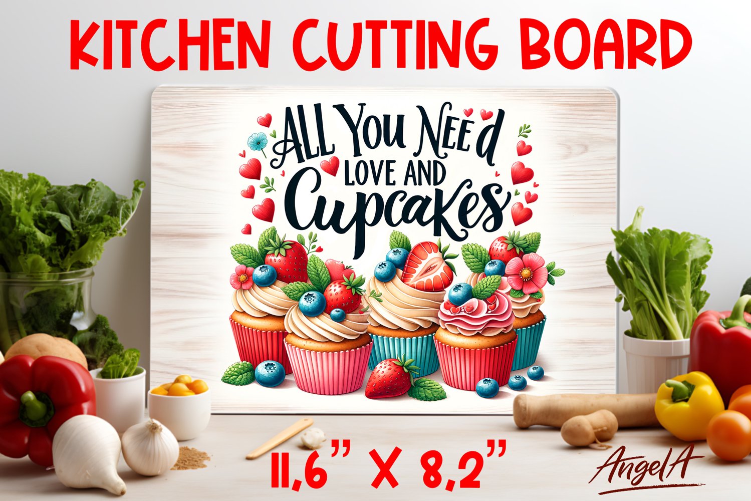 Kitchen cutting board is design for sublimation with funny kitchen quote All you need is love and cupcakes with cupcakes illustration. Also this kitchen design is perfect as kitchen sublimation wall decor.