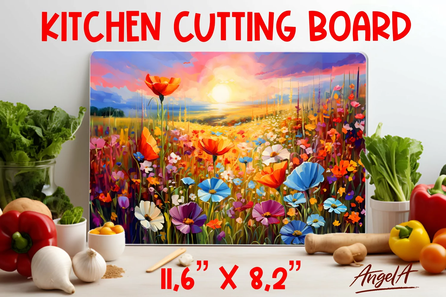 Floral Kitchen cutting board is design for sublimation of field of flowers, colorful flowers in oil paint texture.