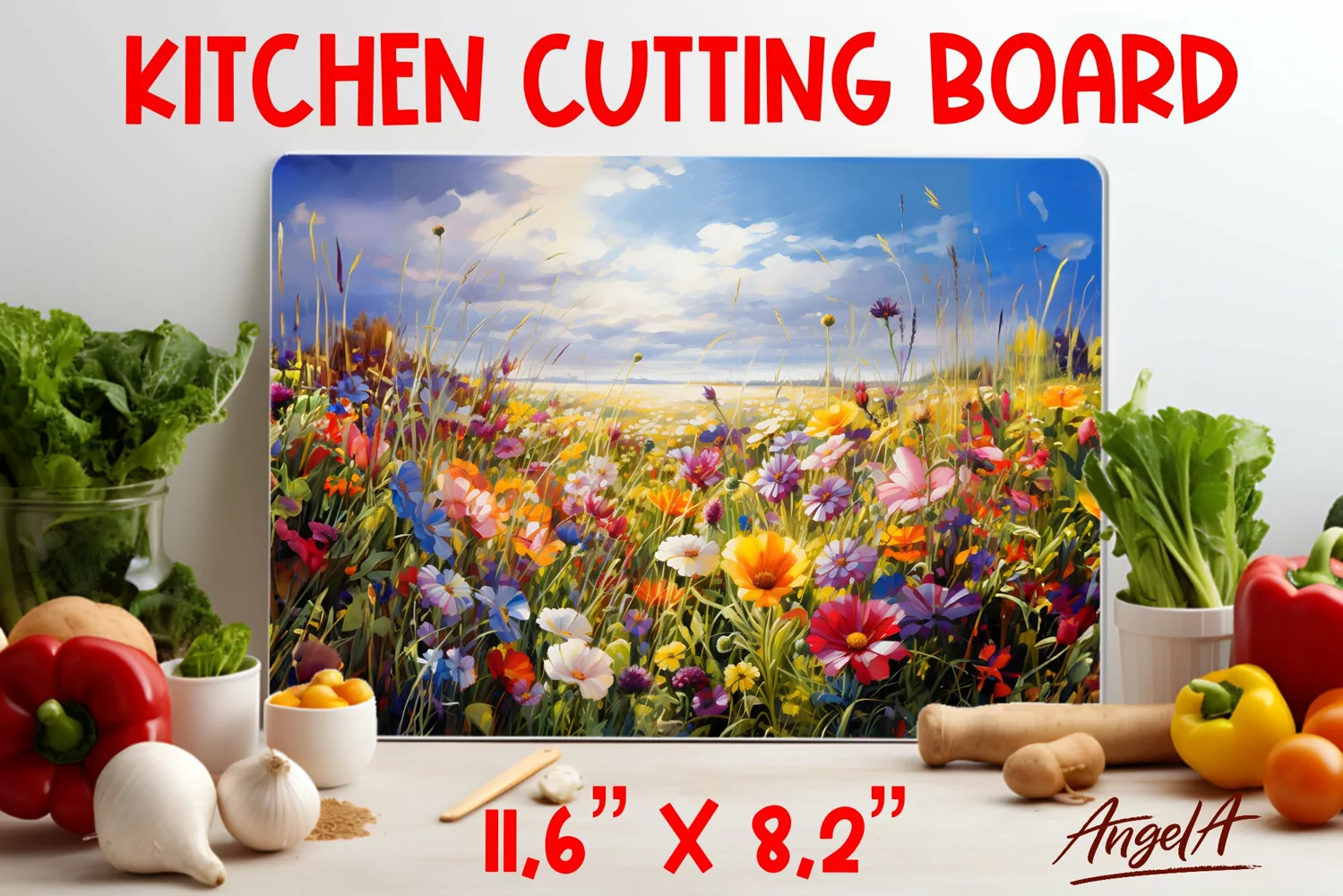 Floral Kitchen cutting board is design for sublimation of field of wildflowers, colorful flowers in oil paint texture.