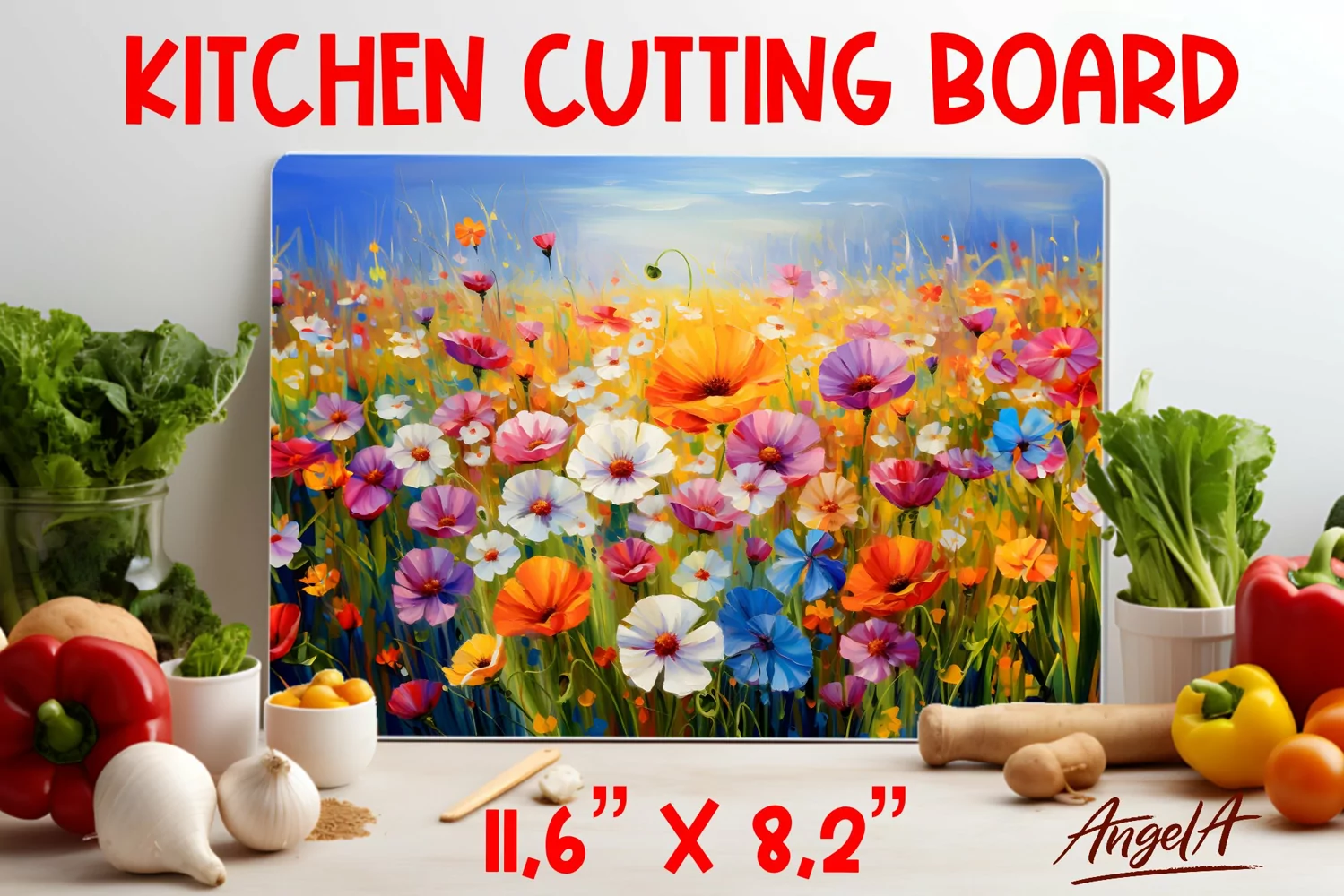 Floral Kitchen cutting board is design for sublimation of field of wildflowers, daisy, poppy flowers in oil paint texture.