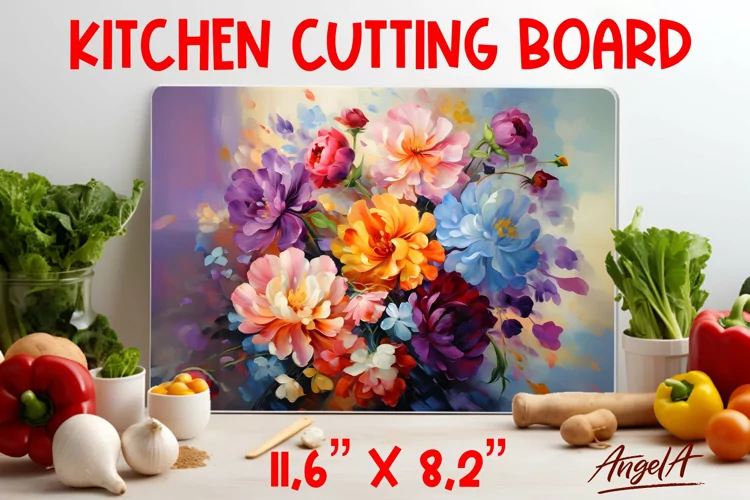 Floral Kitchen cutting board is design for sublimation of bouquet of flowers, peonies flowers oil paint texture.