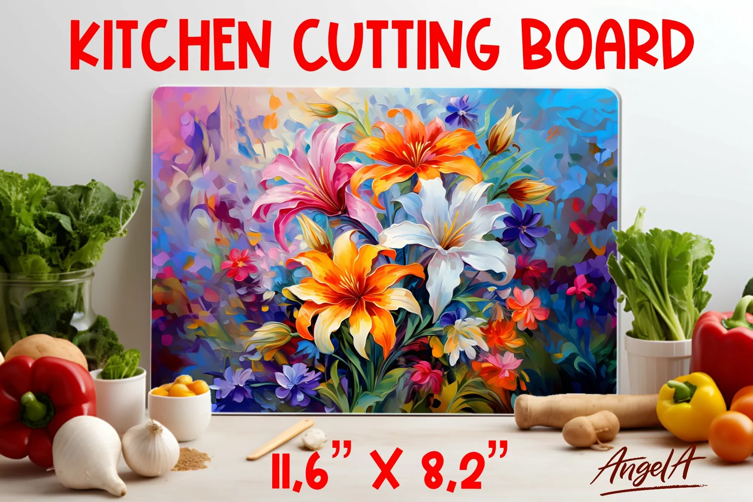 Floral Kitchen cutting board is design for sublimation of bouquet of flowers, lily flowers oil paint texture.