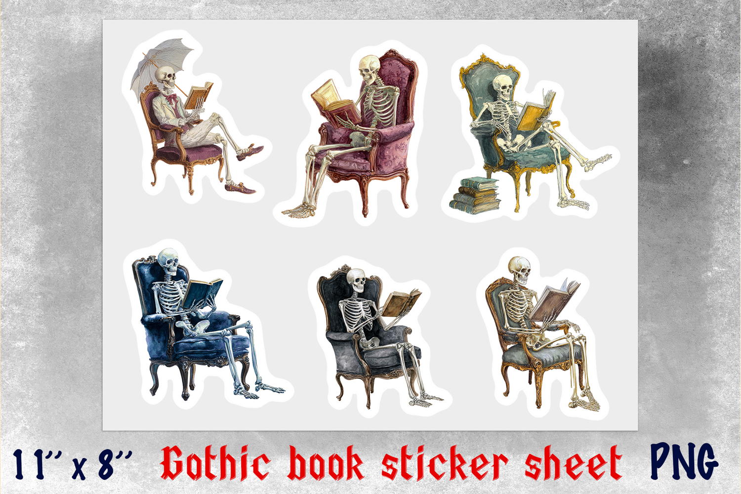 Gothic Book lover sticker sheet Funny skeleton reading book example image 1