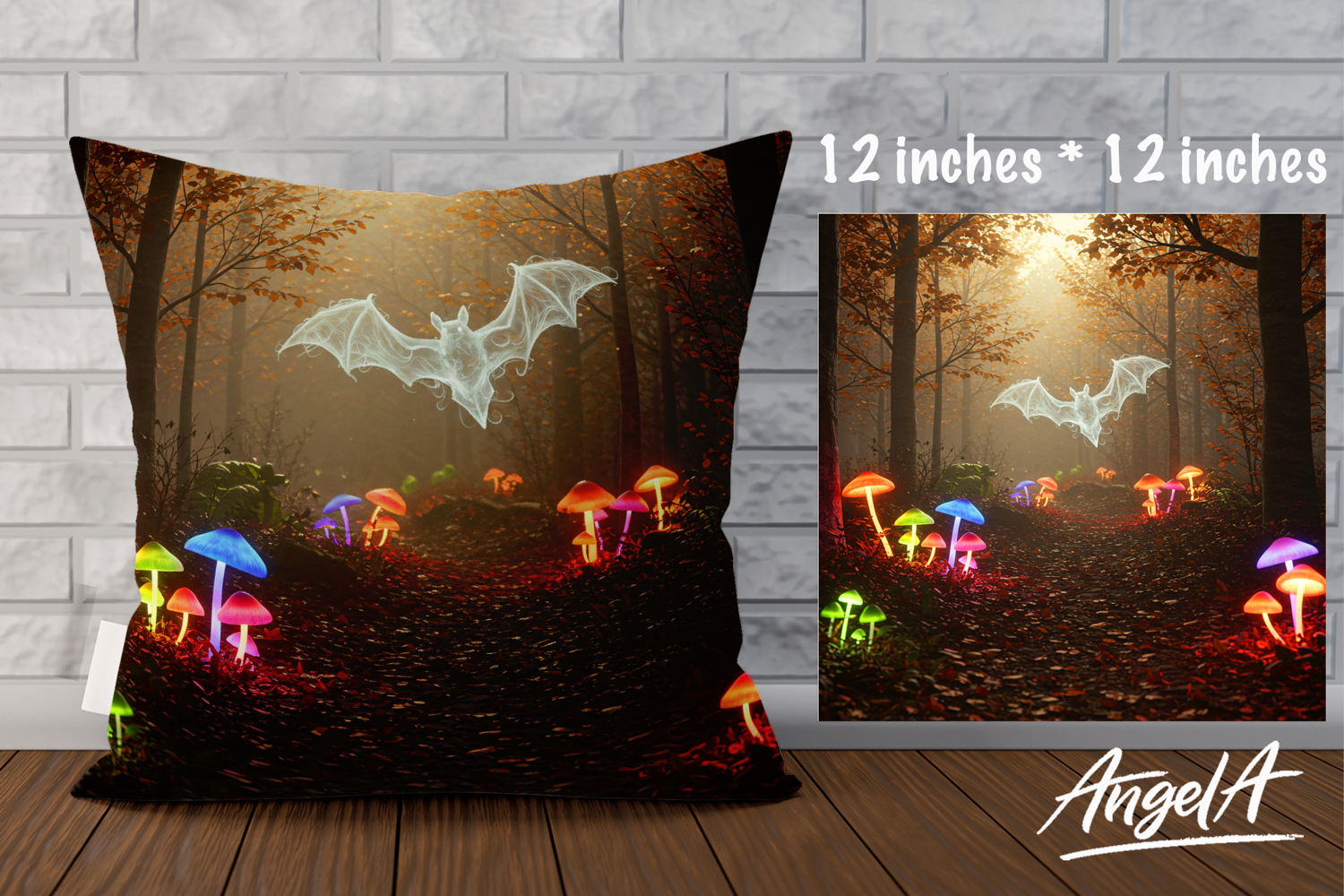 Dark Forest Halloween Sublimation Design Flying Bat Fantasy Mushrooms Square Coasters Design Pillow Case Sublimation Pillow Covers Sublimation Halloween Pillow Cover Halloween Animal Design Fantasy Halloween Design