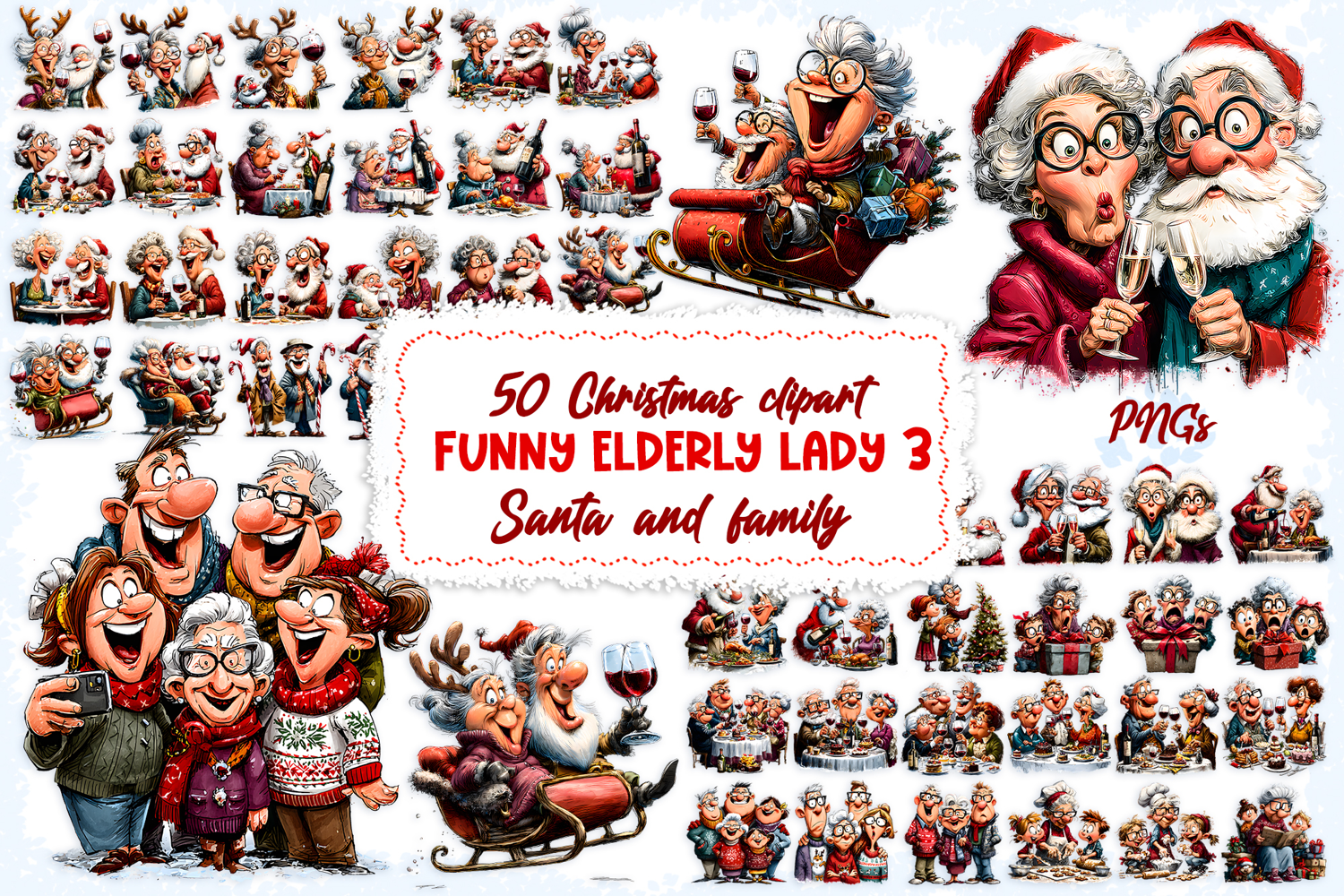 Humor Christmas clipart bundle includes 102 designs of funny old lady with family and Santa Claus in different situations: drinking wine, cooking, in Santa's sleigh, dancing, laughing, with Christmas tree. You can use these funny designs for T-shirt, pillow, home decor, sign or other your project!