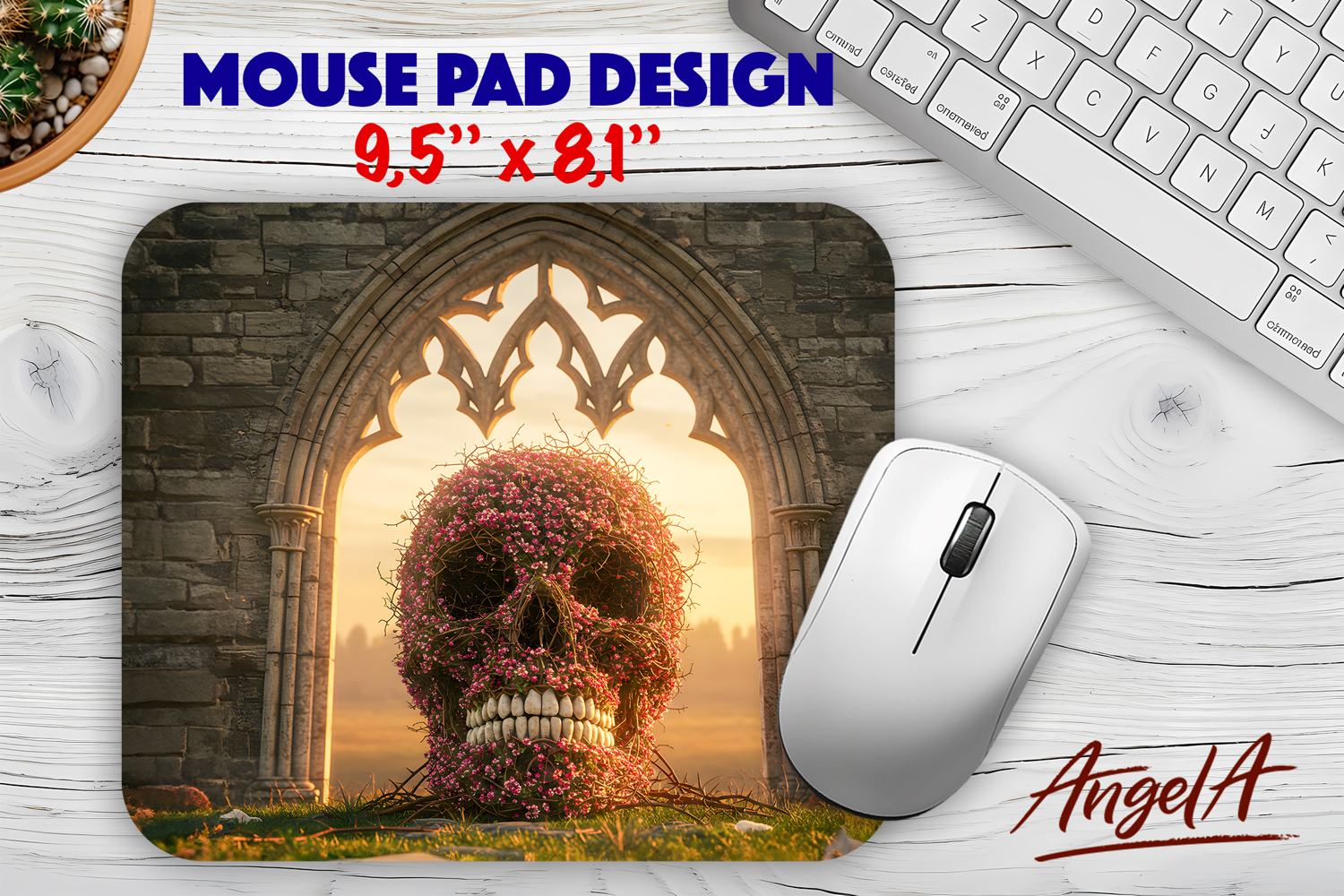 Fantasy mouse pad template is mouse pad sublimation design with a gothic 3d floral skull.