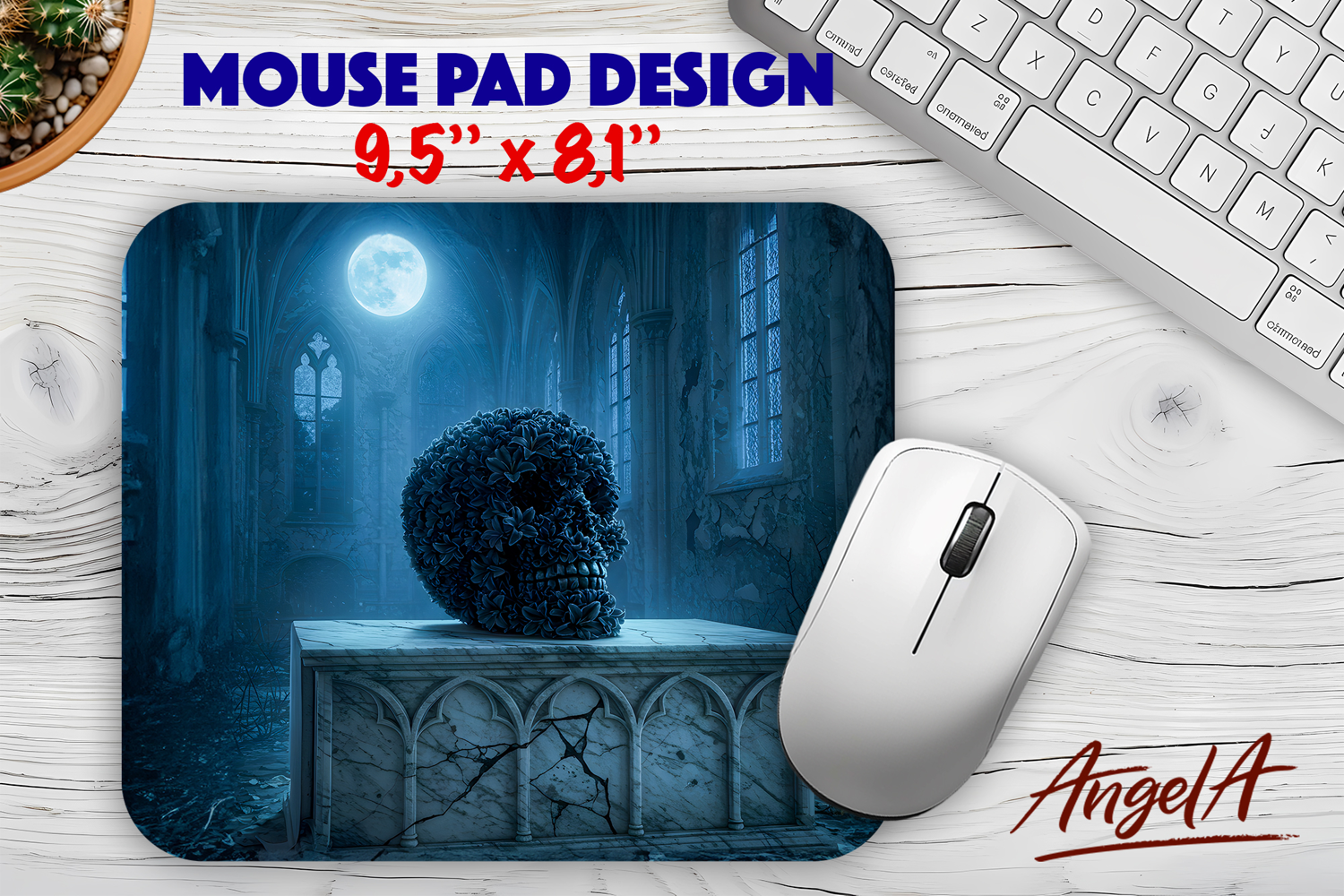 Fantasy mouse pad template is mouse pad sublimation design with a 3d gothic skull on tombstone in gothic castle at the night.
