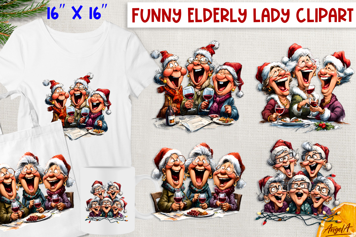Christmas clipart elderly old lady with friends in Santa hat example image 1