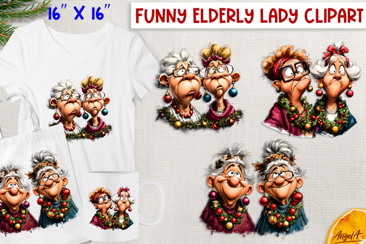 Humor Christmas clipart is a design of funny two friends elderly lady with Christmas light and ornament. You can use these funny designs for T-shirt, pillow, home decor, sign or other your project!