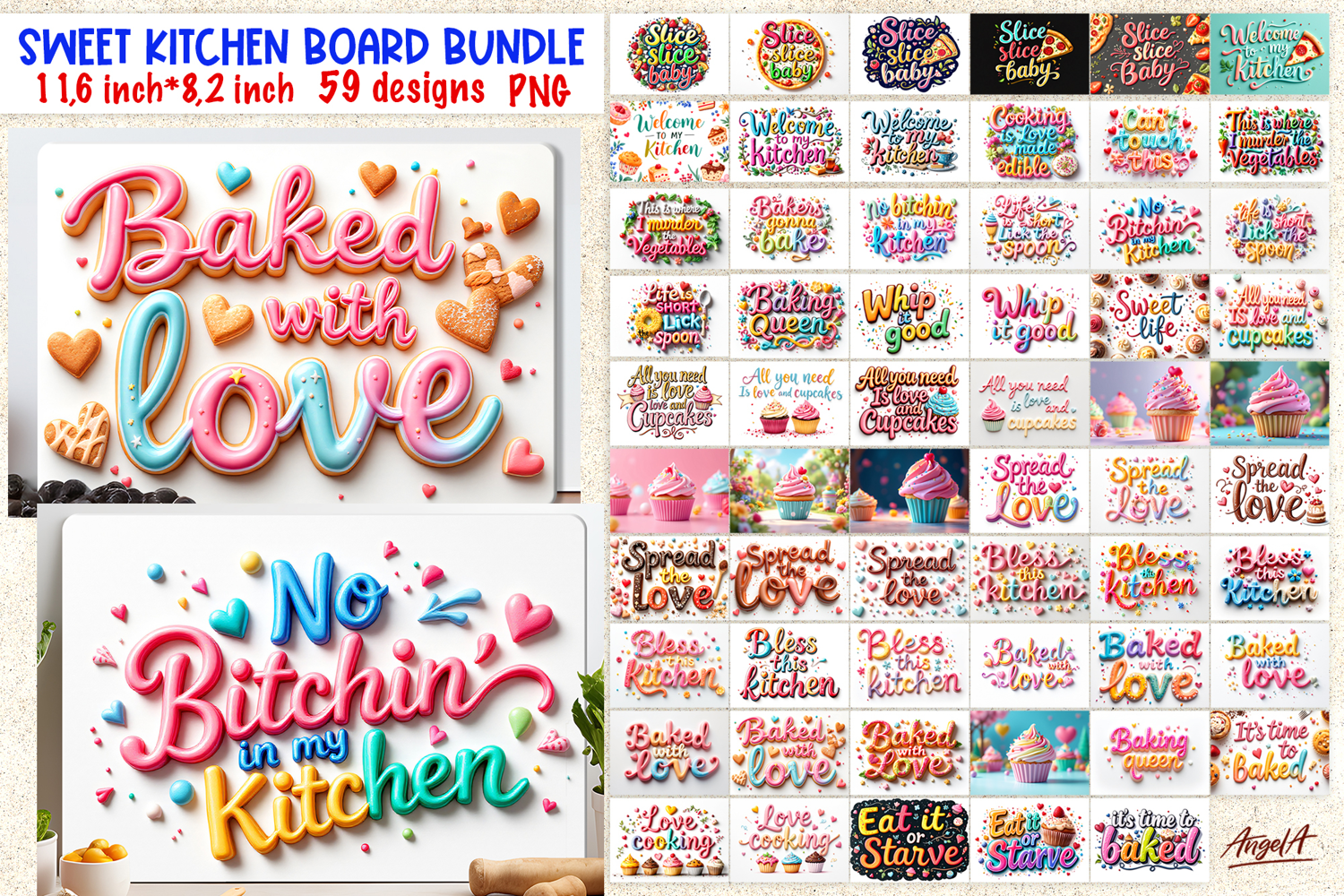 Kitchen cutting board bundle includes 59 designs of chopping board designs. Kitchen cutting board is design for sublimation with funny kitchen quotes created in 3d lettering style with cookies, muffin, cupcakes, biscuits. Also these kitchen design is perfect as kitchen sublimation wall decor.