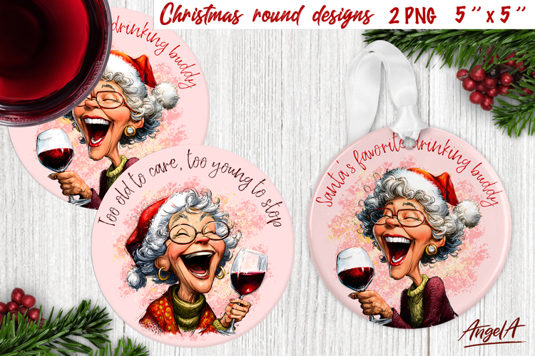 Humor Christmas coaster is a round design of funny elderly old lady wearing in Santa hat with glass of wine and funny quotes. Also you can use these designs also as round car coaster, round keychain designs, Christmas ornament.
