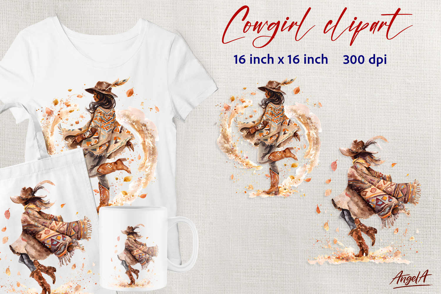 Autumn Dancing Cowgirl clipart Watercolor T-shirt design PNG example image 1