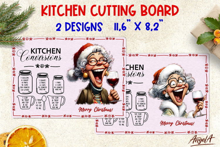 Christmas cutting board Kitchen board Old lady drinking wine example image 1