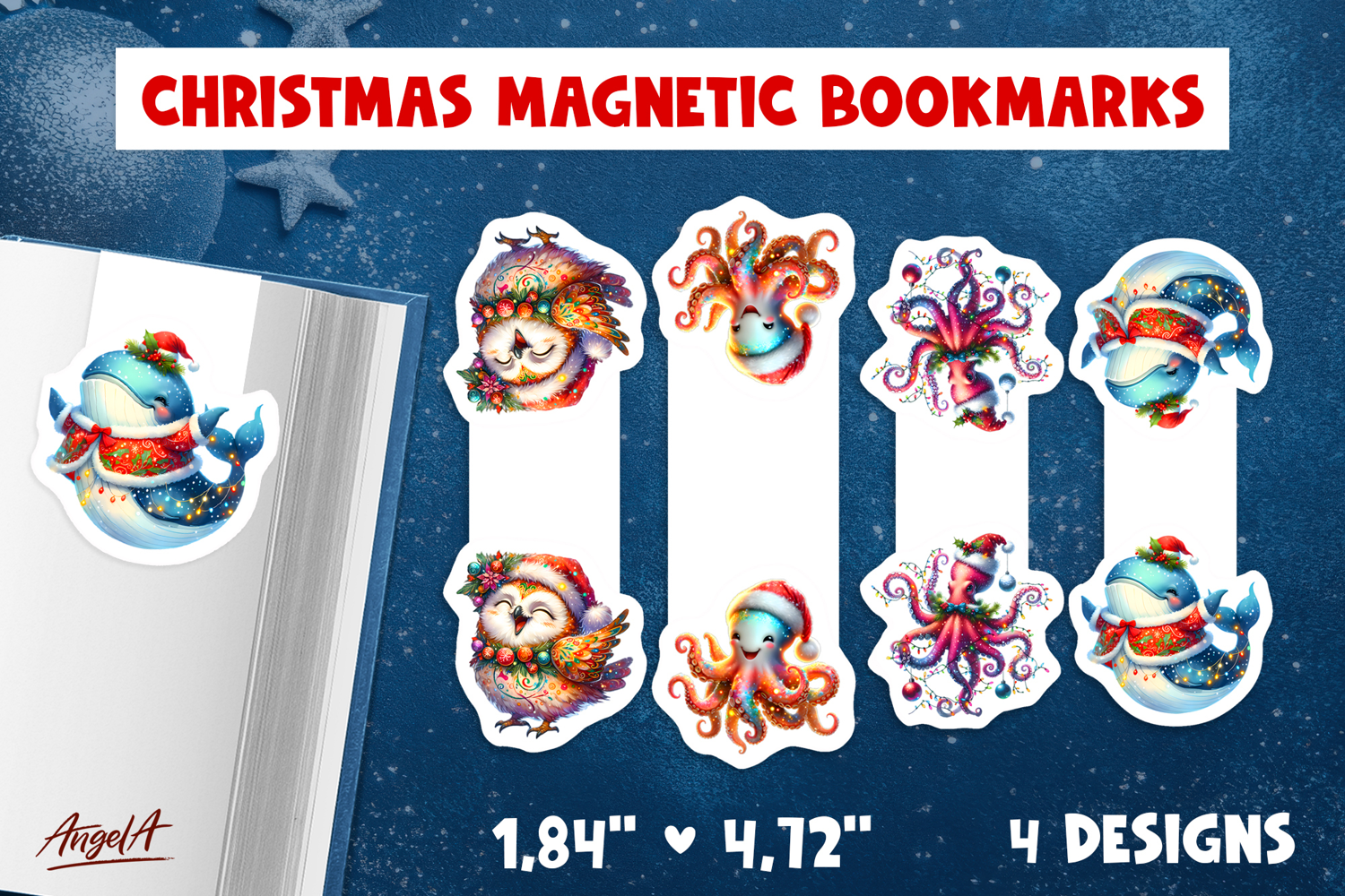 Christmas magnetic bookmark is a design of a funny Christmas dancing bird owl, sea animals octopus, whale.