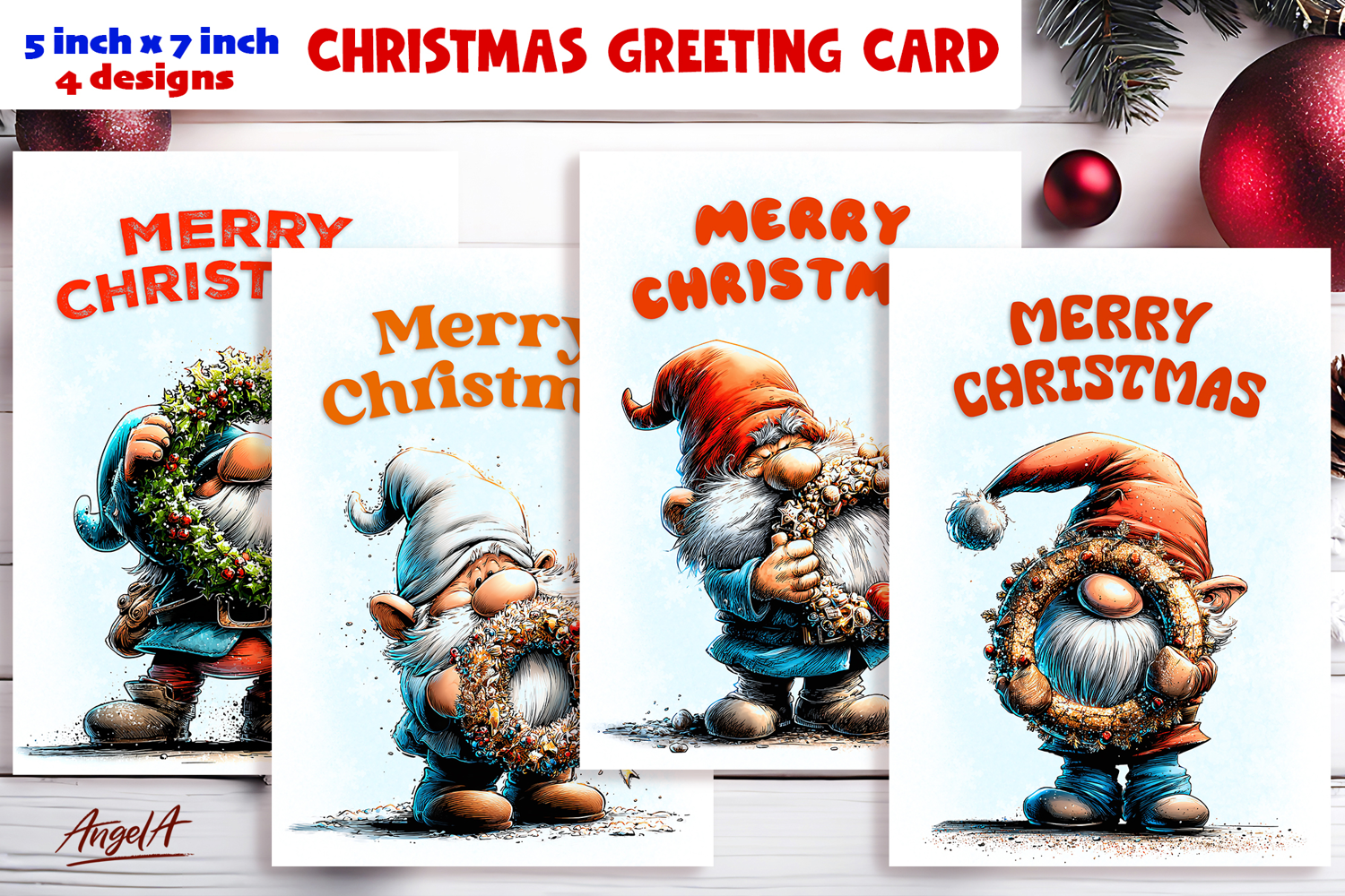Christmas card design is printable Christmas card of funny fairy Christmas gnomes with wreath and text Merry Christmas.