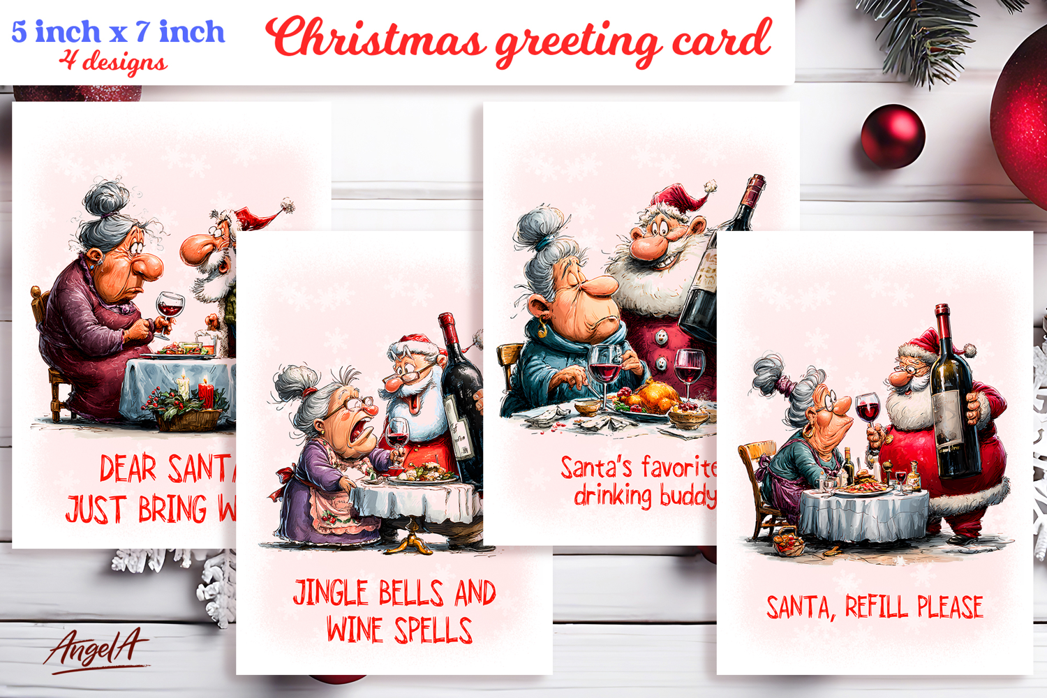Christmas card design is printable Christmas card of a cute elderly lady, Grandma with Santa Claus  drinking wine and Christmas wishes, funny quote.