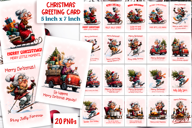 Christmas card design is printable Christmas card of a cute elderly lady, Grandma drinking wine, skiing, in Santa's slight, in vintage red truck, holiday wishes, funny quote.