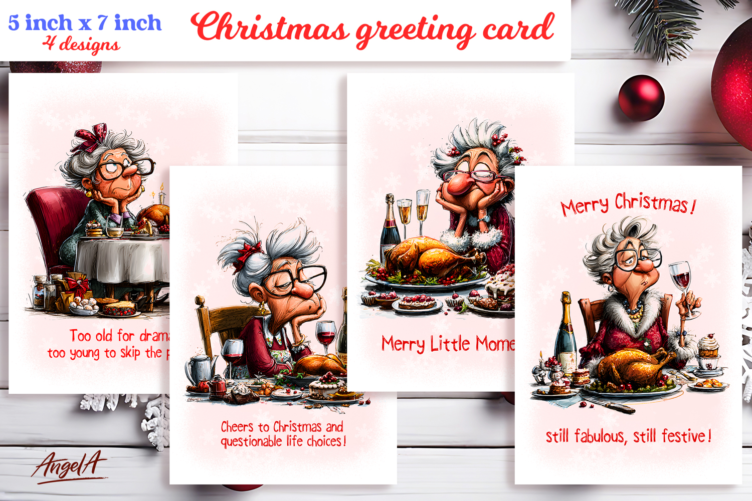 Christmas card design is printable Christmas card of a cute elderly lady, Grandma drinking wine, holiday wishes, funny quote.