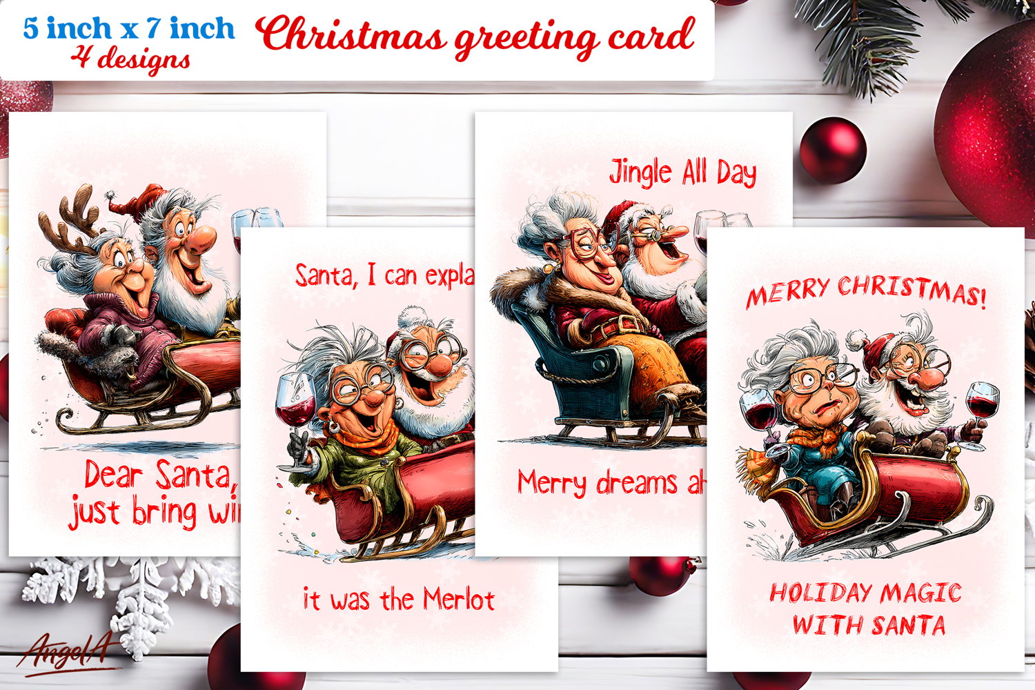 Christmas card design is printable Christmas card of a cute elderly lady with Santa Claus in Santa's sleight, drinking wine, celebrating Christmas, holiday wishes, funny quote, Christmas sayings.