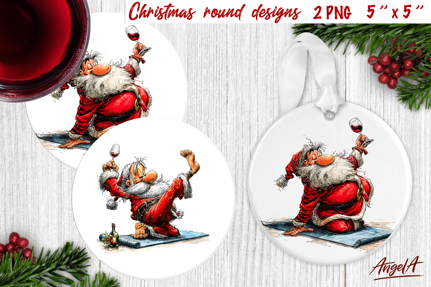 Humor Christmas coaster is a round design of a funny Santa Claus drinking wine, doing yoga. Also you can use these designs also as round car coaster, round keychain designs, Christmas ornament.