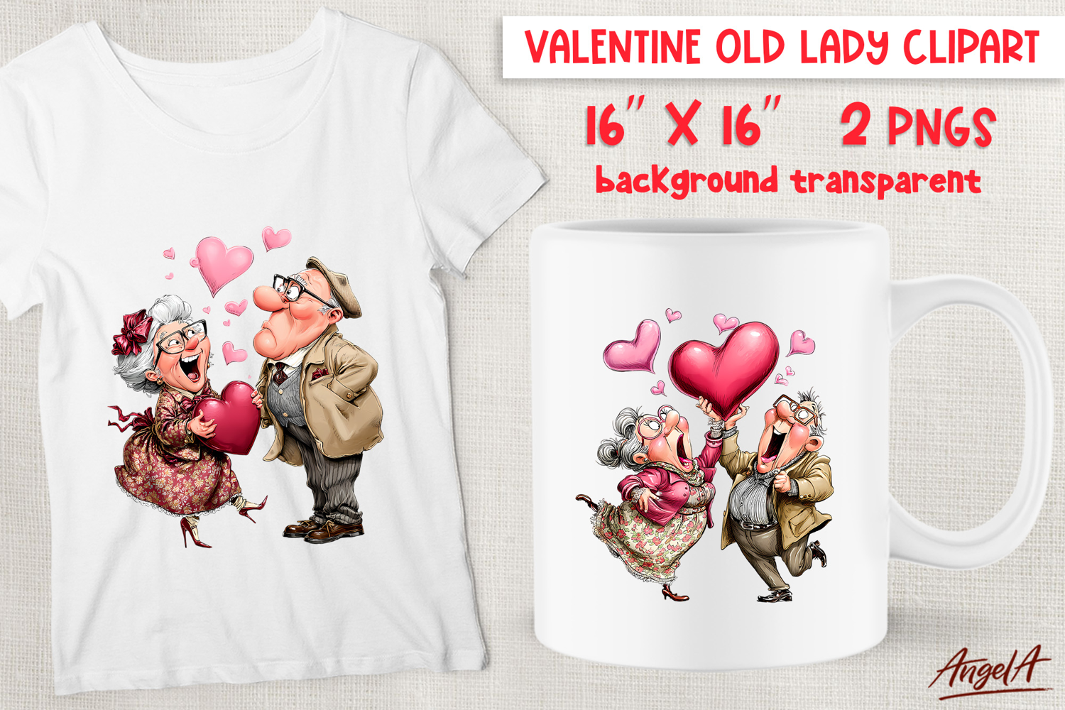 Humor Valentine clipart with funny elderly people in love, funny grandparents with pink hearts. You can use these designs for T-shirt, mug, tote bag, wine tumbler or other your project! Also you can use these design for Grandparents day as gift for your love!
