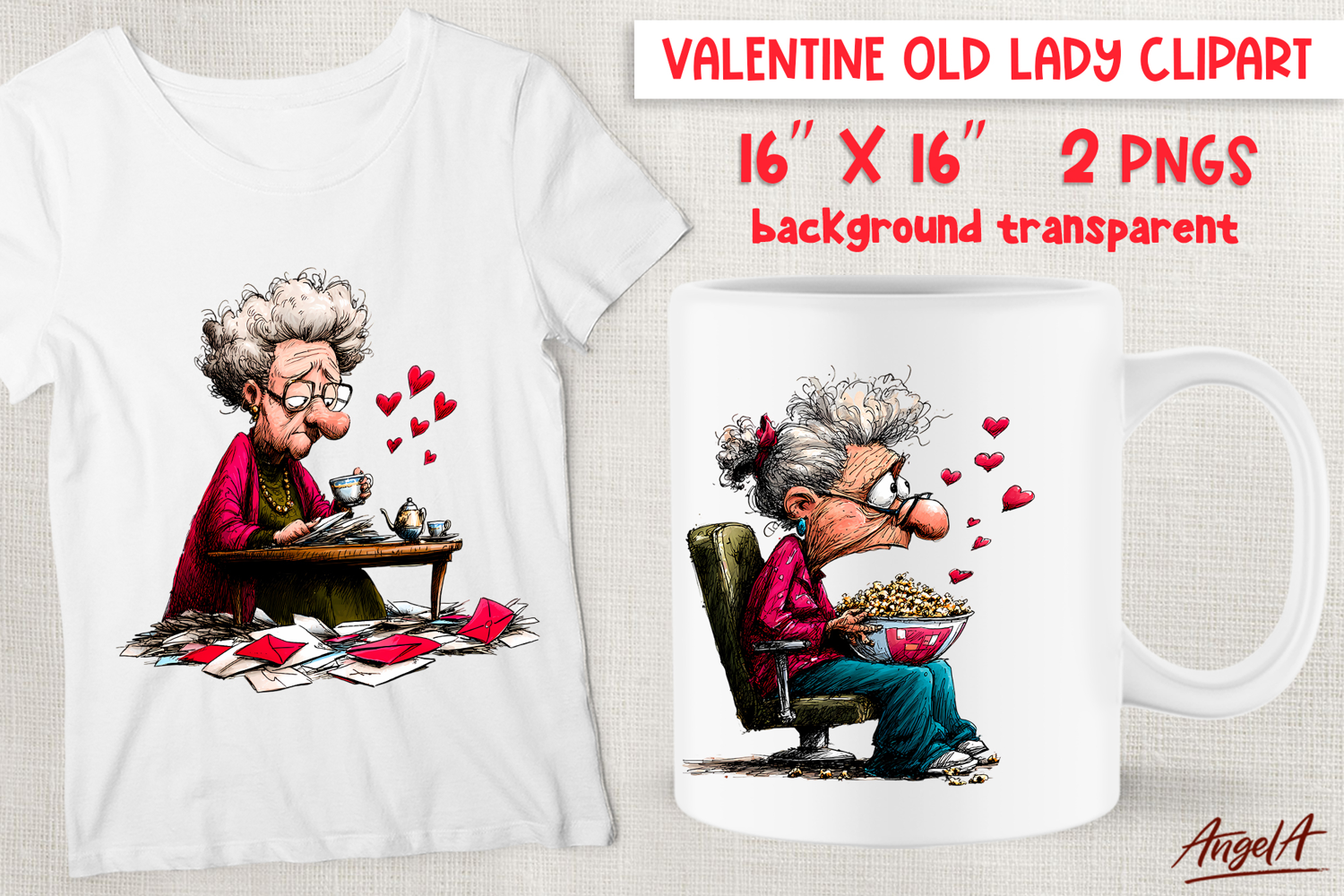 Humor single Valentine clipart with cute elderly lady reading letters, drinking tea, watching TV with popcorn. You can use these designs for T-shirt, mug, tote bag, wine tumbler or other your project! Also you can use these design for Grandparents day as gift for your love!