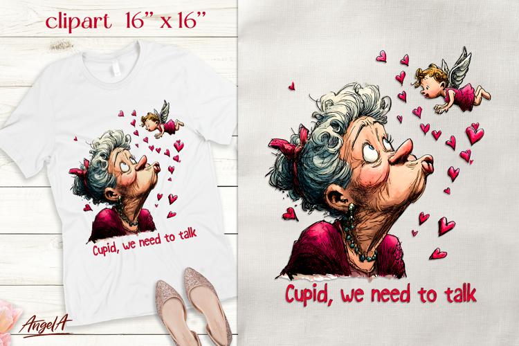 Humor single Valentine funny elderly old lady holding a red rose with hearts, cupid and Valentine romantic quote. You can use these designs for T-shirt, mug, tote bag, wine tumbler or other your project!