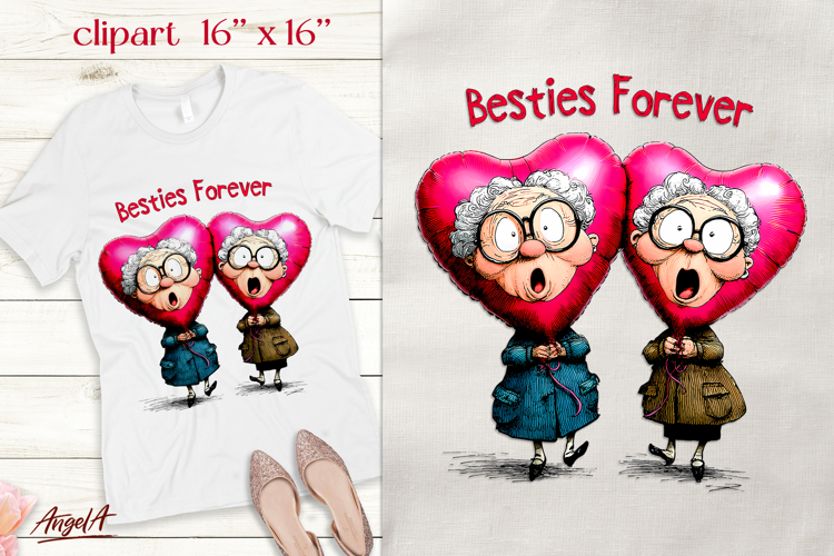 Humor single Valentine funny elderly old lady with best friend holding balloons in heart shape, and funny quote "besties forever". You can use these designs for T-shirt, mug, tote bag, wine tumbler or other your project!