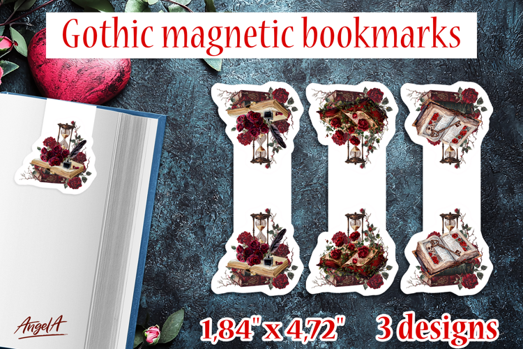 Similar Design Products to Gothic magnetic bookmarks Floral open book, hourglass, roses