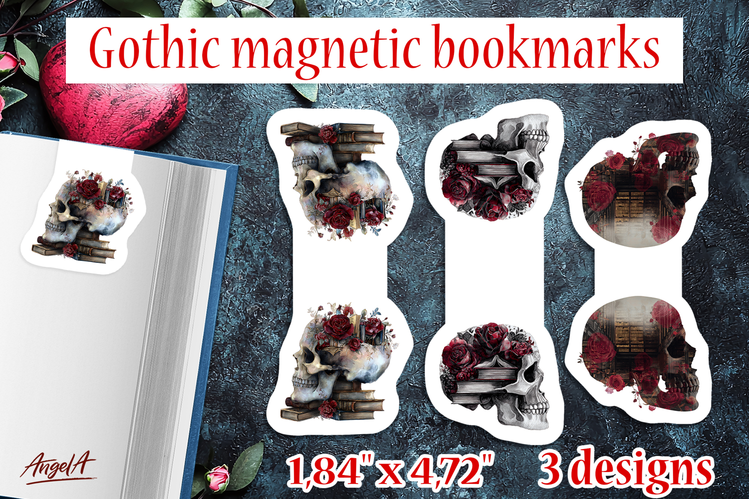 Floral Gothic magnetic bookmarks Skull book stack roses example image 1