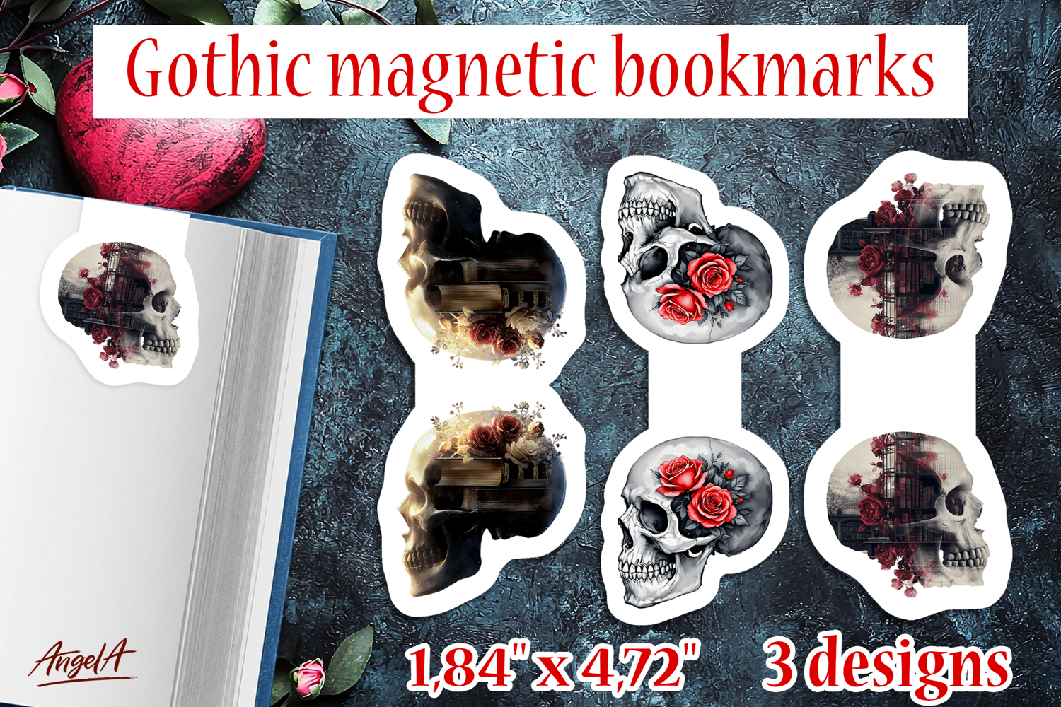 Gothic magnetic bookmark is a design of a skull with a gothic floral skull, red roses, stack of books, double exposure.