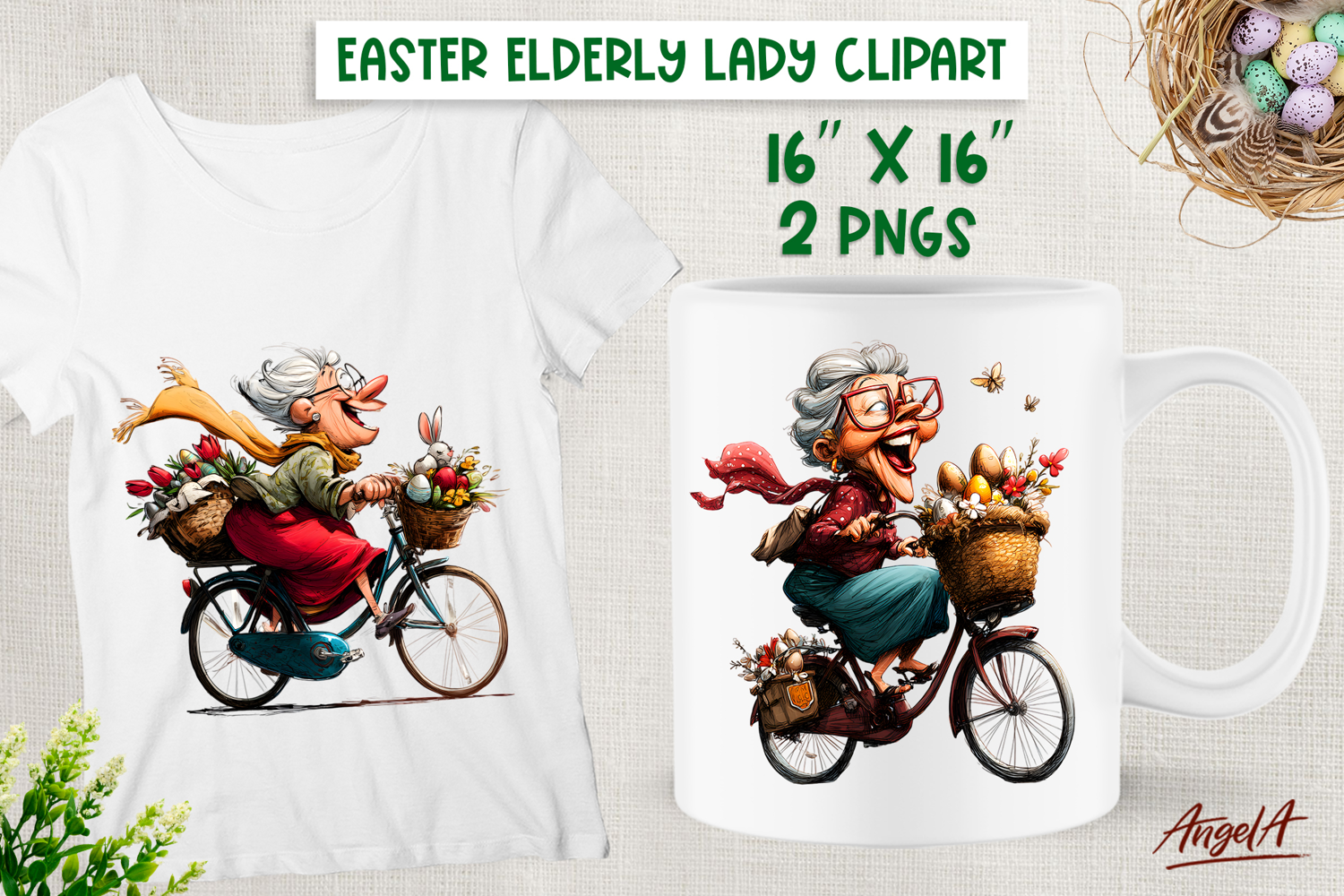 Humor Easter clipart with cute elderly lady on a bicycle with a basket with eggs, bunny. You can use these designs for T-shirt, mug, tote bag, wine tumbler or other your project! Also you can use these design for Grandparents day as gift for your love!