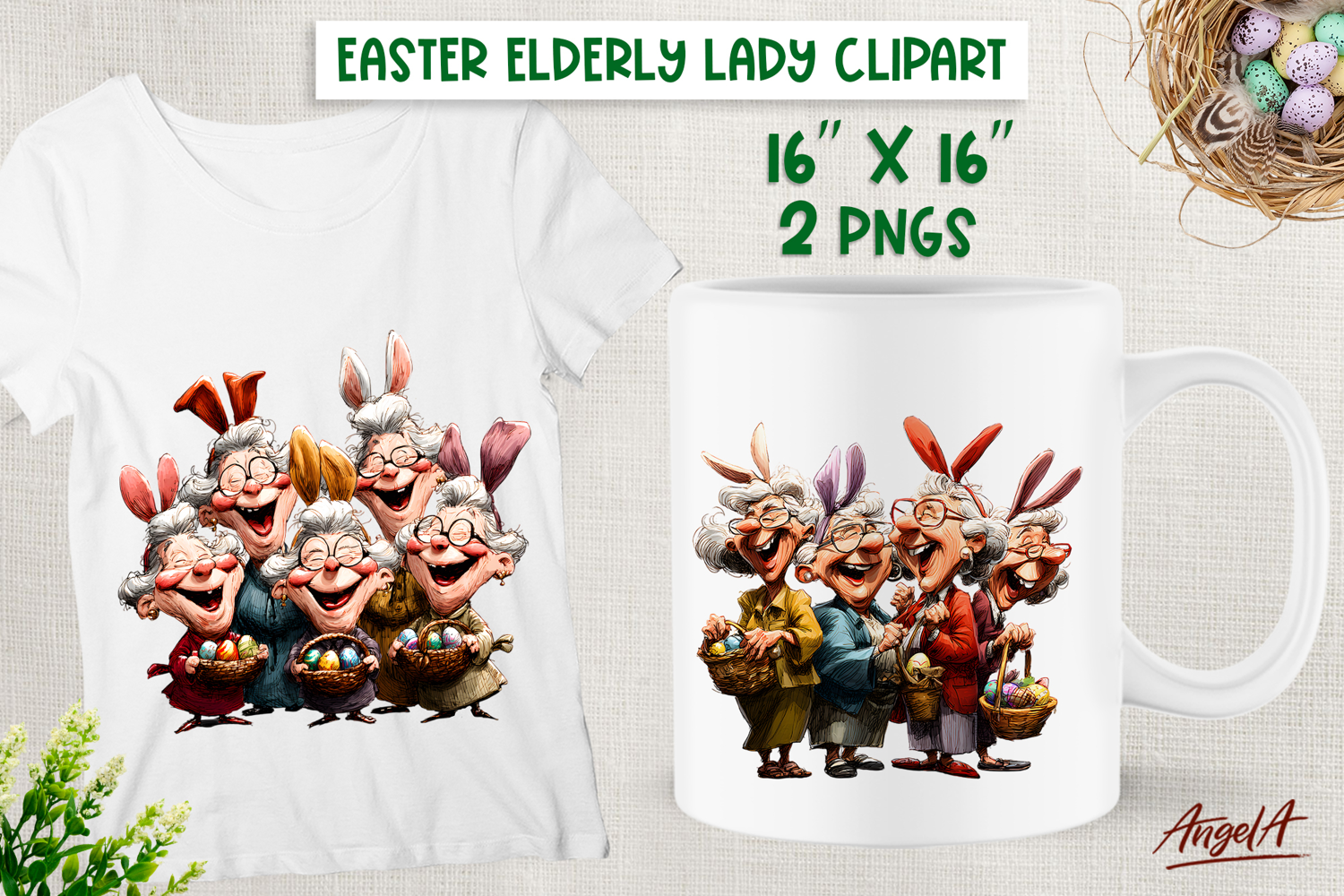 Humor Easter clipart with cute elderly lady with best friends, holding Easter eggs, Easter basket, wearing in bunny ears. You can use these designs for T-shirt, mug, tote bag, wine tumbler or other your project! Also you can use these design for Grandparents day as gift for your love!