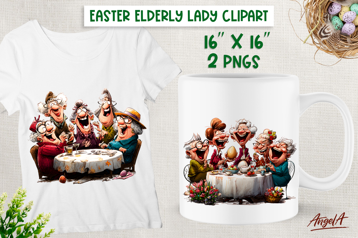 Humor Easter clipart with cute elderly lady with best friends celebrating Easter. You can use these designs for T-shirt, mug, tote bag, wine tumbler or other your project! Also you can use these design for Grandparents day as gift for your love!