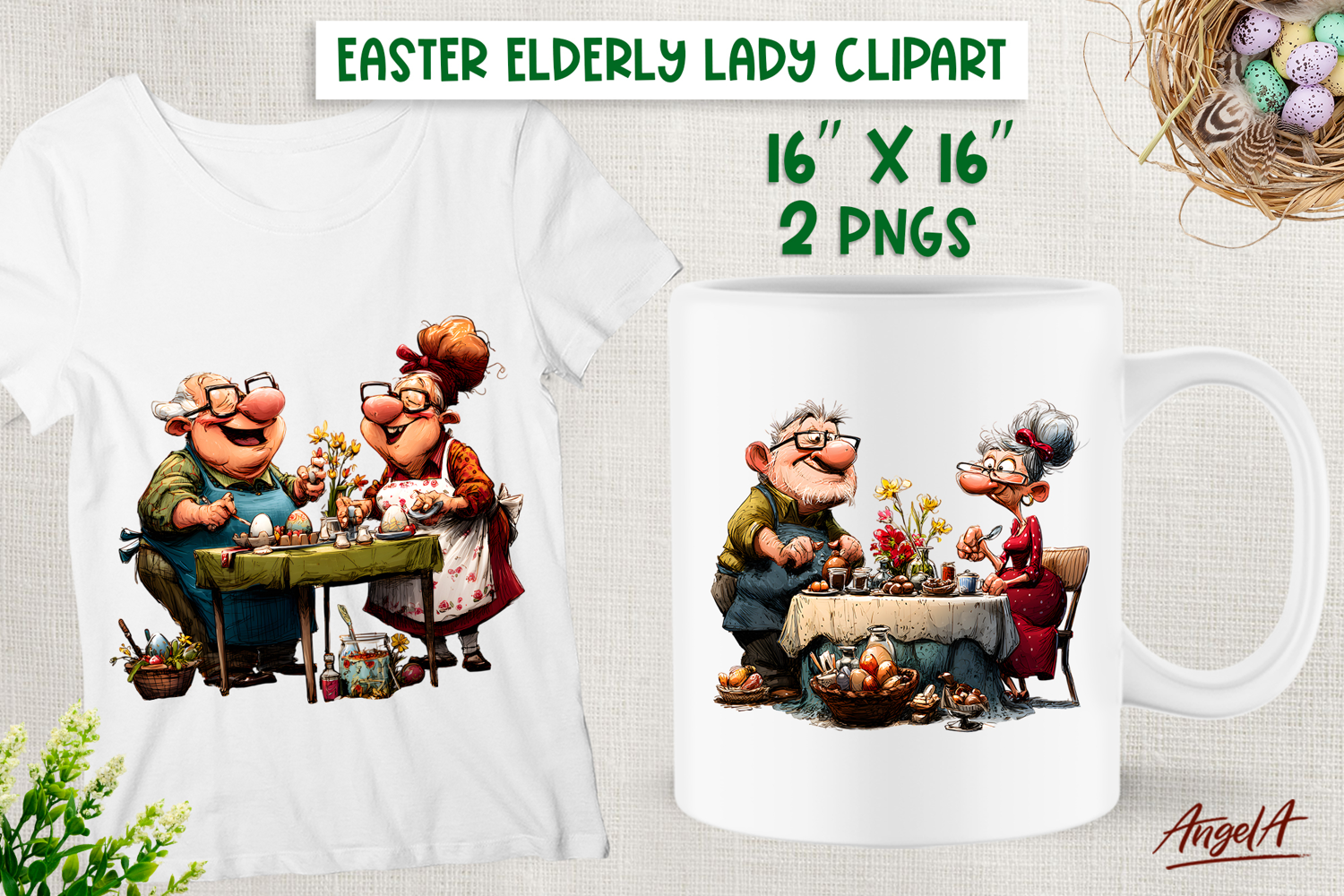 Humor Easter clipart with cute old lady, grandparents, celebrating Easter. You can use these designs for T-shirt, mug, tote bag, wine tumbler or other your project! Also you can use these design for Grandparents day as gift for your love!
