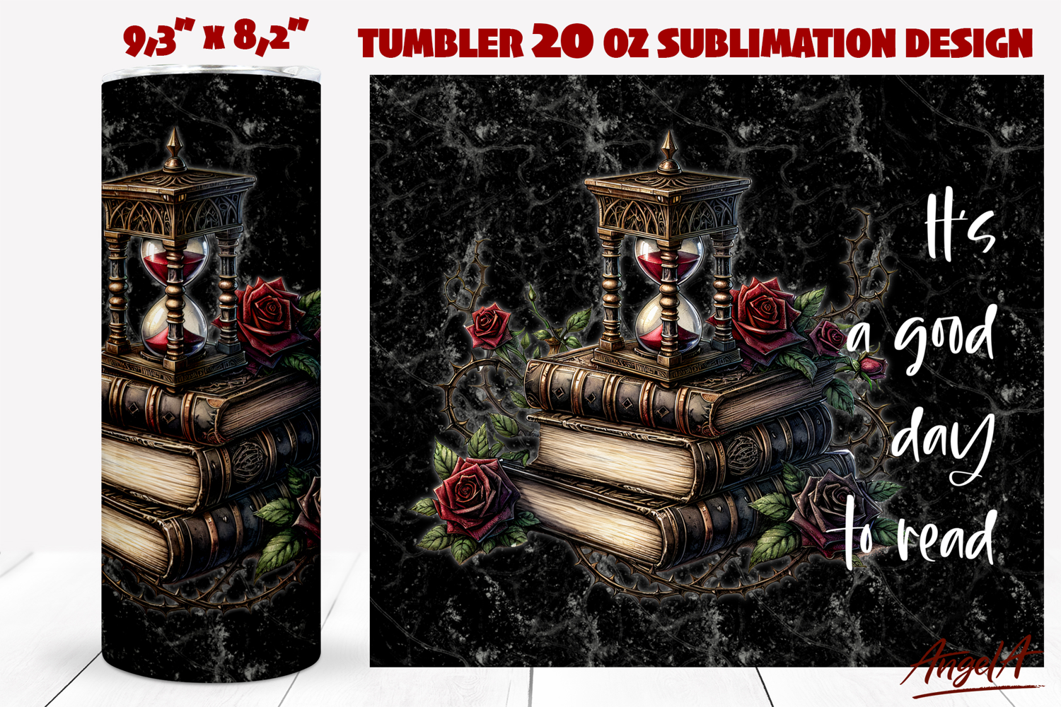 Book lover gothic tumbler wrap design is 20 oz skinny tumbler sublimation wrap design of a gothic illustration a track of book stack, vintage hourglass, roses and book lover quotes "It's a good day to read" on black texture background.