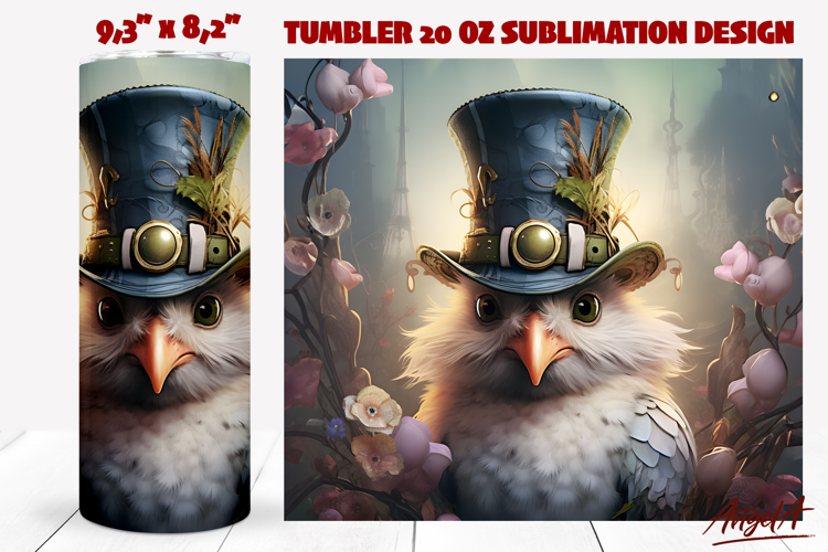 Animal tumbler design is sublimation design of funny chicken with glasses, a hat, clock, gears in steampunk style. You can add any text.