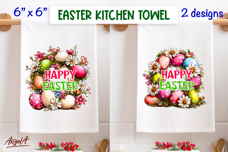 Easter kitchen towel is a funny design of a spring floral wreath of a colorful Easter eggs, flowers and flowers and a text "Happy Easter". Also this design is perfect as greeting card, mug sublimation design, t shirt print and other your project!
