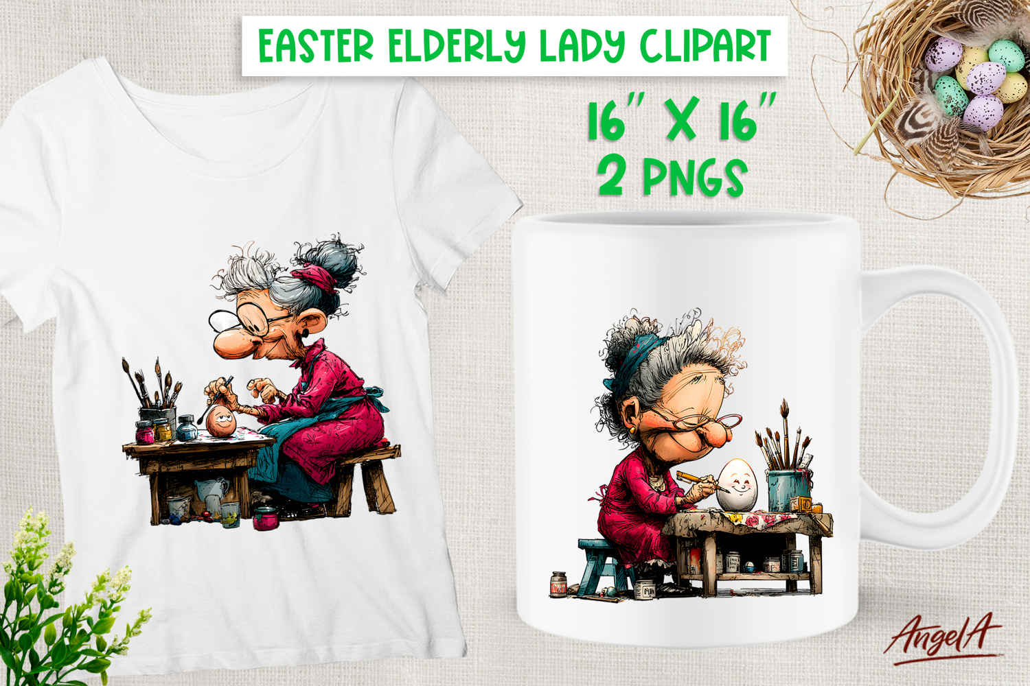 Humor Easter clipart with cute elderly lady coloring easter eggs. You can use these designs for T-shirt, mug, tote bag, wine tumbler or other your project! Also you can use these design for Grandparents day as gift for your love!