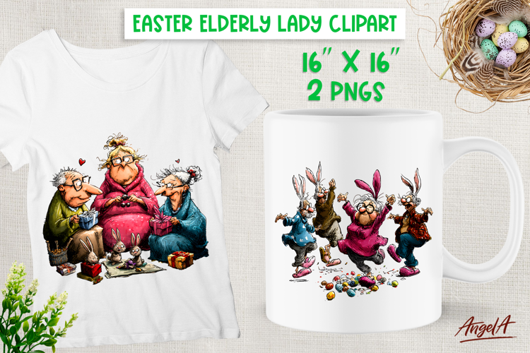 Humor Easter clipart with cute elderly lady with best friends with bunny ears dancing. You can use these designs for T-shirt, mug, tote bag, wine tumbler or other your project! Also you can use these design for Grandparents day as gift for your love!