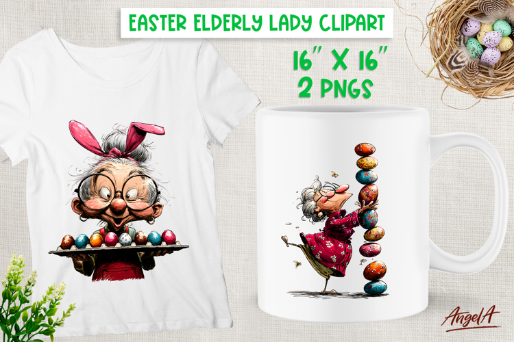 Similar Design Products to Elderly old lady holding Easter eggs clipart Bunny ears PNG