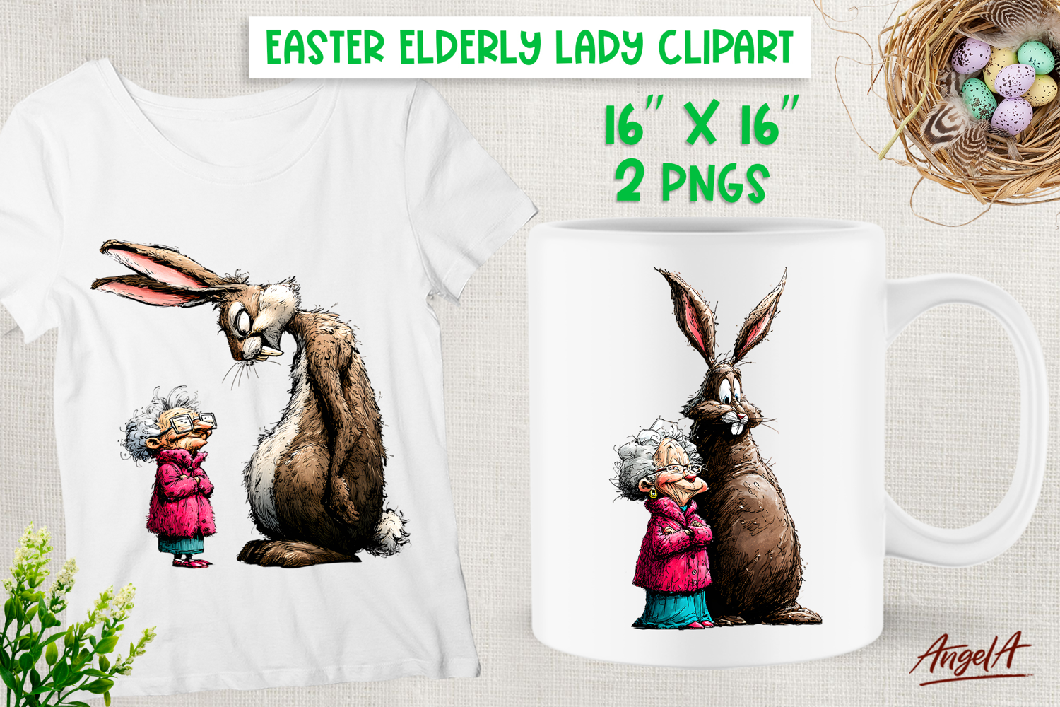 Humor Easter clipart with a cute happy elderly lady with bunny, Easter rabbit. You can use these designs for T-shirt, mug, tote bag, wine tumbler or other your project! Also you can use these design for Grandparents day as gift for your love!