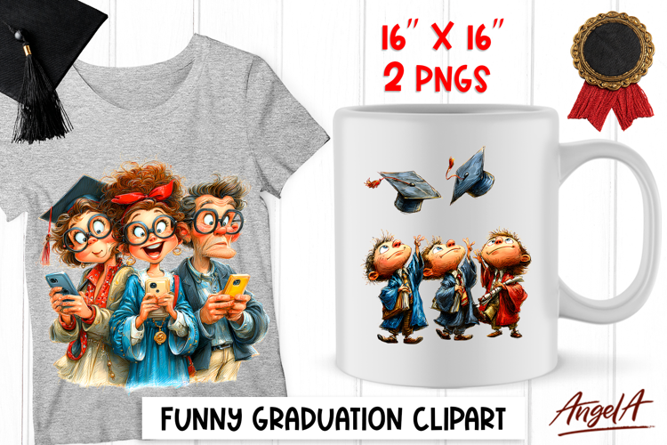Graduation clipart with a student with her family, father and mother, and 3 students holding a diploma wearing in graduation cap. You can use these designs for T-shirt, mug, tote bag, wine tumbler, apron or other your project!