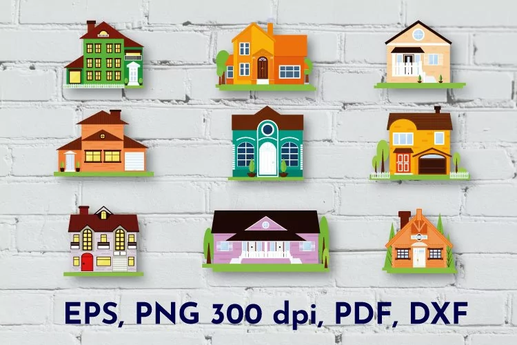 You'll receive ZIP Folder with 9 PNG, 9 EPS 10 of each house and 1 PDF,1 DXF, 1 EPS with all of them.