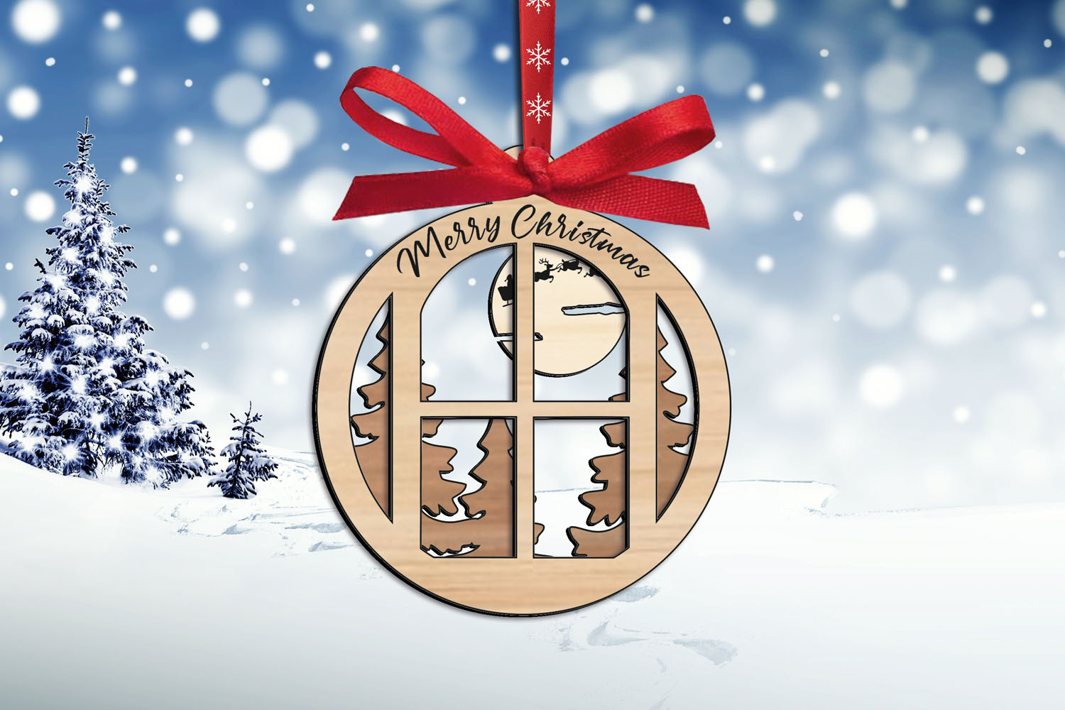 This remarkable Merry Christmas Tree Ornament with cosy home window, winter woods and the moon with Santa Clause on his sledge is a great House Warming Home Decor for the greatest holiday - Christmas!