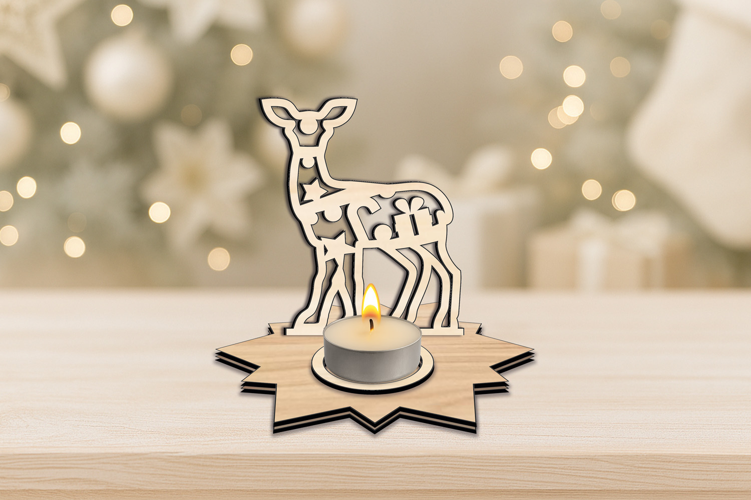 This great Deer Fawn Christmas Candle Holder on a star-shaped base is an awesome gift for the Christmas Holiday! The idea of it is to put a tea candle with a base of up to 1.77 inches (4.5 cm) into the circle cut hole and light it up! Enjoy the warmth and the joy of it during the Christmas festivities! Keep in mind that this product is a multi-layered item, so use glue suitable for the material that you will make it from.