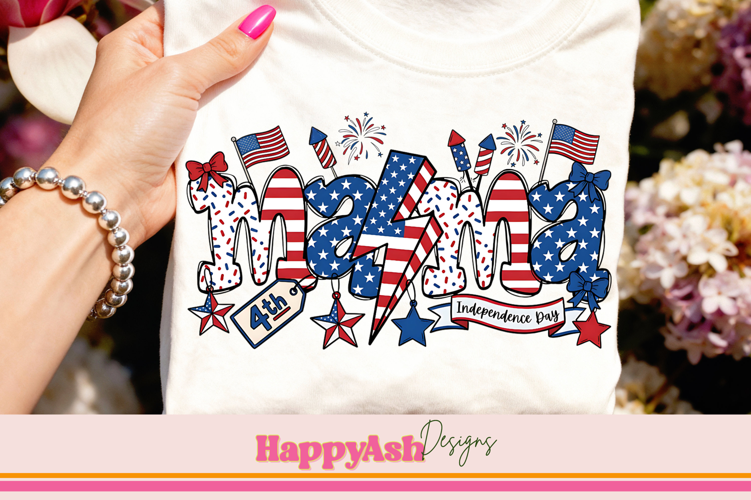 Celebrate Independence Day in style with this adorable 4th of July Mama design! Featuring patriotic red, white, and blue patterns, fireworks, stars, bows, American flags, and a bold lightning bolt, this retro-inspired artwork is perfect for shirts, totes, and festive apparel. Ideal for moms who love showing their USA pride on July 4th, Memorial Day, or any patriotic celebration. High-quality PNG for sublimation, DTF, DTG, printables, and crafting projects.